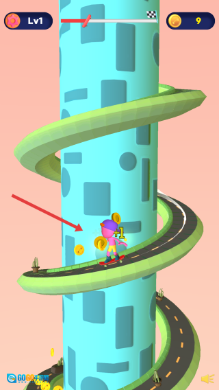 3、关卡推进:完成Lv1赛道后,通过积累金币解锁后续新关卡,在过程中体验滑板竞速的刺激以及螺旋赛道带来的挑战乐趣。