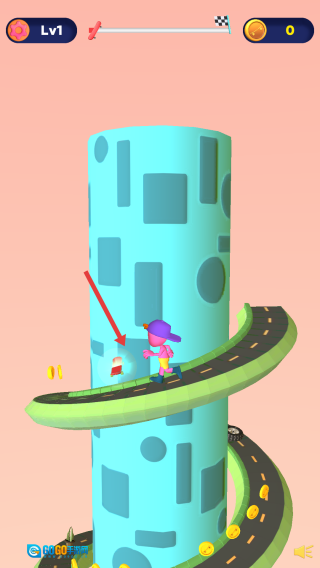 2、赛道滑行:顺着螺旋状的赛道向下滑行,途中收集金币,避开带有红色标识的障碍,推动进度条前进,朝着终点旗的方向冲刺。