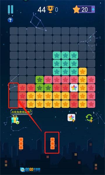 如图可见,当颜色一样的星星相互连接起来时,点击这些星星就能实现消除。