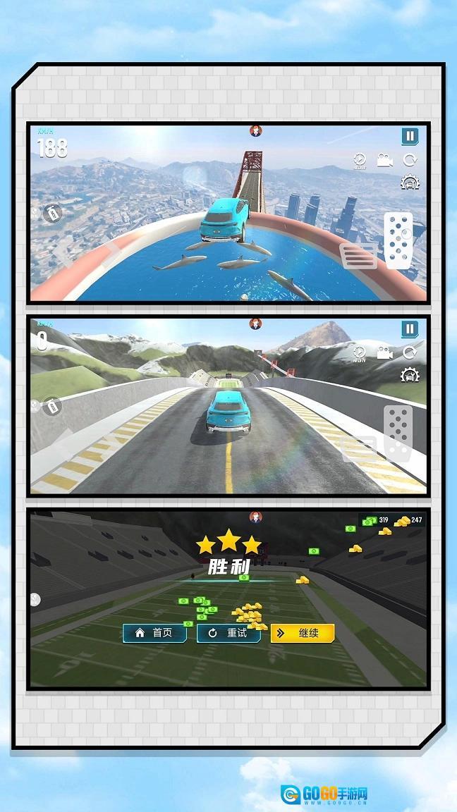 4.关卡的难度从简单到困难逐渐增加,不断考验玩家的驾驶技巧,收集到的资源可以用于赛车的改装和升级。