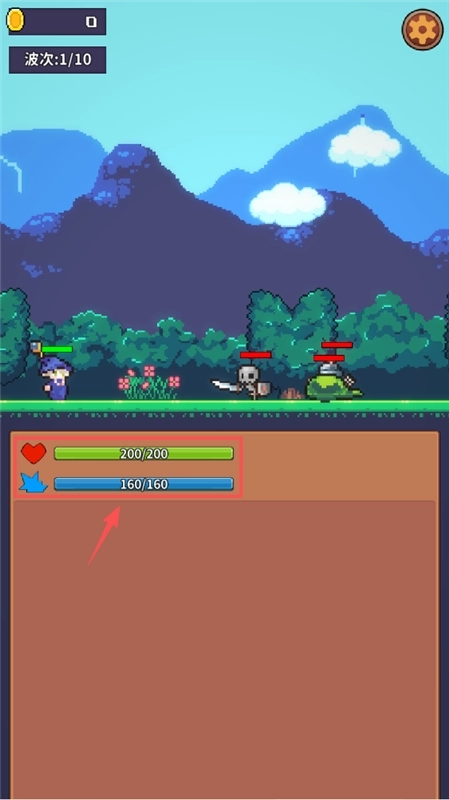 2、进入游戏后,左上角会显示金币和波次,血量和蓝条在画面下方,记得通过战斗击败怪物来获取金币和推进波次。
