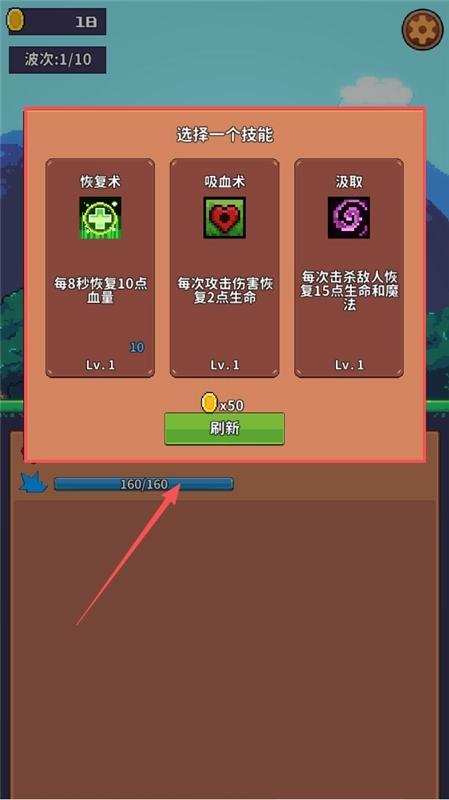 3、在闯关过程中,会弹出技能选择界面,你可以从恢复术、吸血术等技能里挑一个喜欢的来强化你的角色能力。