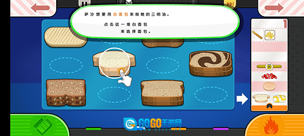 6、下图所示即为“制作台”,这这里可以制作你的三明治,萨沙想要用白面包来做她的三明治,点击这一堆白面包,来选择面包;