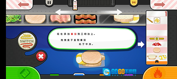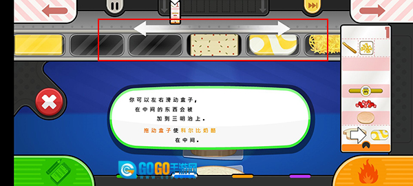 7、你可以左右滑动盒子,在中间的东西会被加到三明治上,拖动盒子使科尔比奶酪在中间;