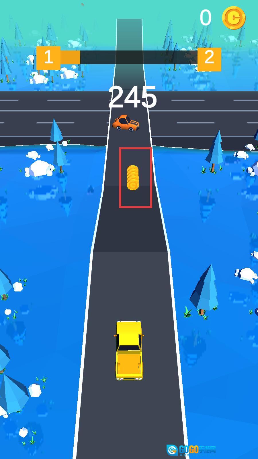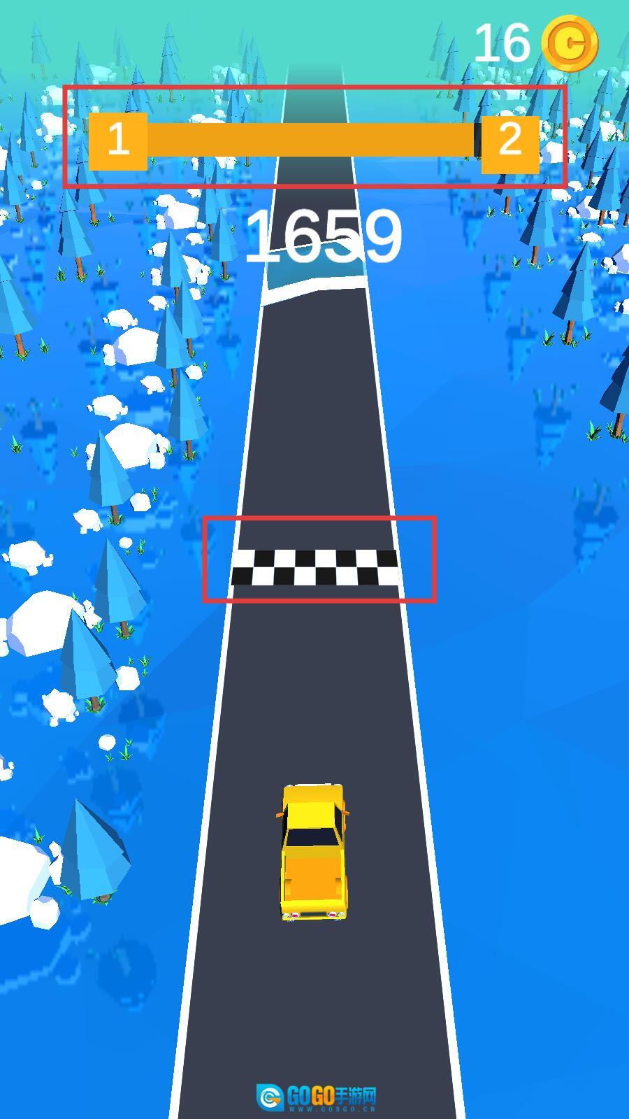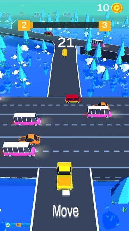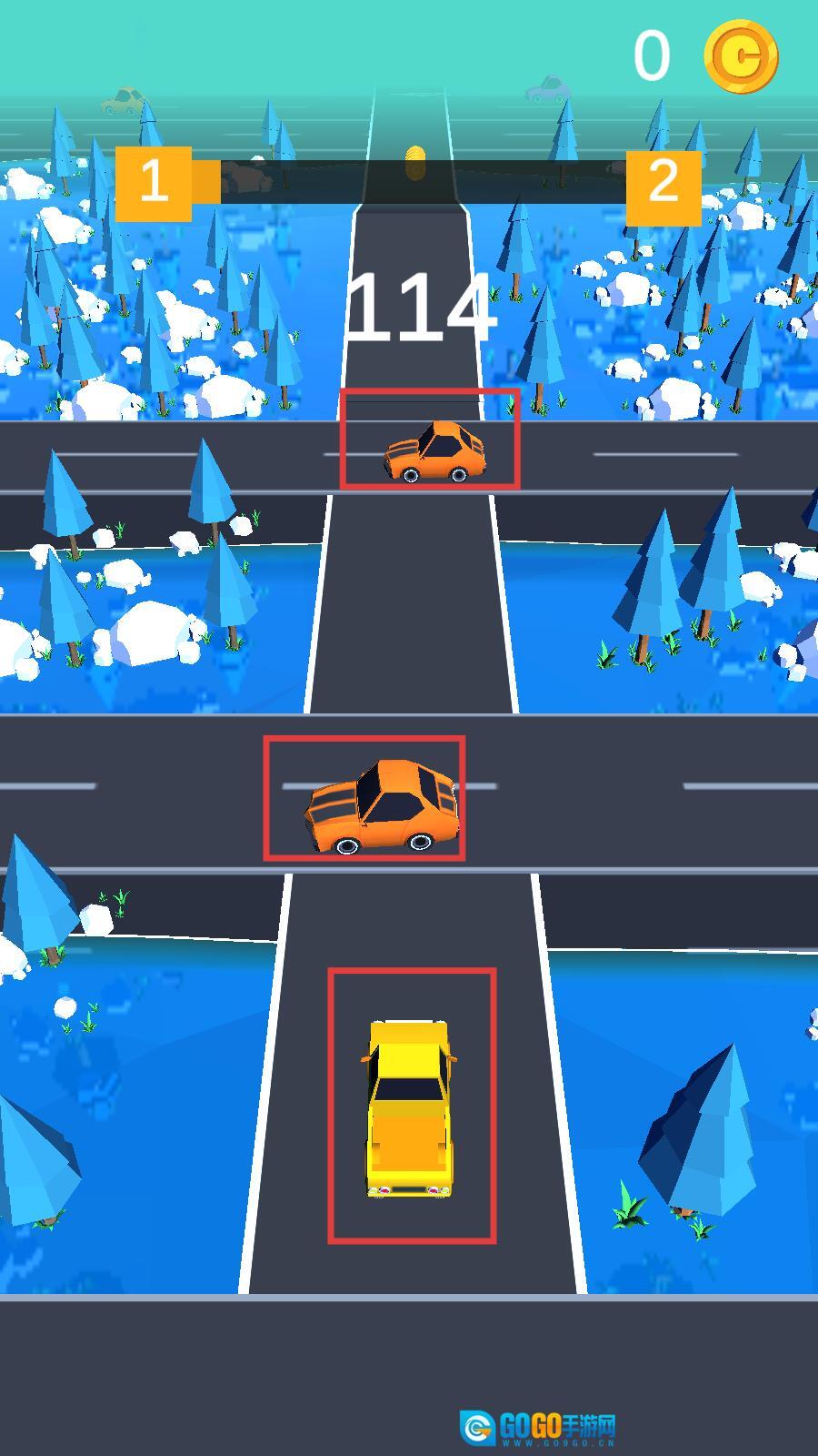 1、长按屏幕可以让黄色小车前行,遇到橙色车辆时,松手停车避让,不要被它们撞下车道了。
