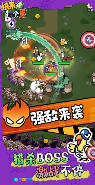【快来打个蛋】是一款割草玩法的地牢,副本很多,玩家们可以组建一个战斗组合,搜索到资源,怪物的种类也会变得更加的多,还可以强化自己的道具,竖版的画面,快速地移动,拟定不同的战术,每局的时间都不长的哦~场景还是比较的细腻的,有喜欢的小伙伴就来吧!
