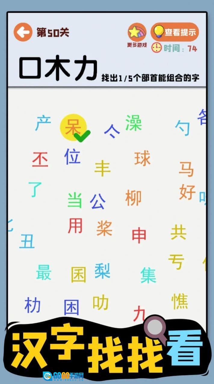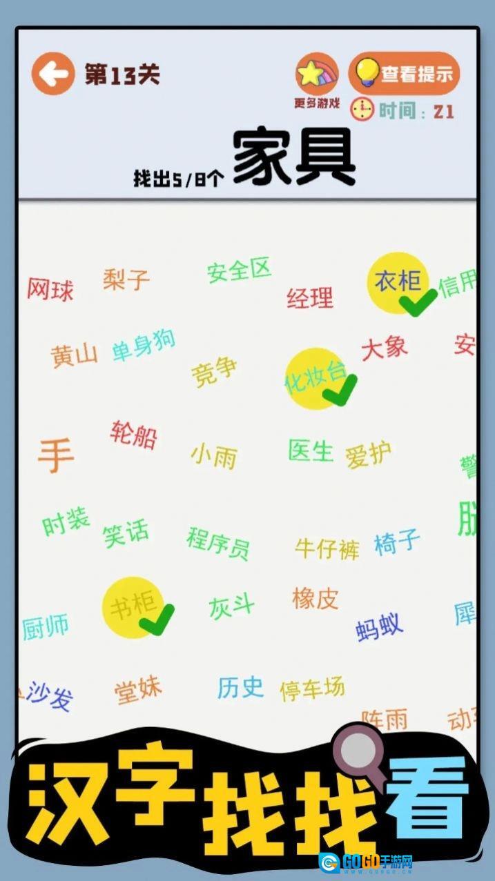 【汉字找找看】这是一款十分有趣的游戏,能让你逐步挑战更高难度,获取更亮眼的分数。它既能测试你的汉字掌握程度与观察力,又能帮你提升识字能力、积累汉字知识。通过寻找和组合汉字,你能更深入地理解汉字的构造与演变过程。游戏不仅要求你精准找出汉字,还需要你在紧张的节奏中保持敏锐的观察力!