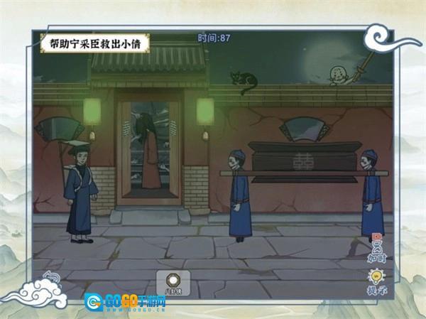 白天时,先点击大门上的八卦镜,接着用锤子敲大门右侧的瓦罐,让宁采臣喝水,之后获取童子尿。点击黑猫切换场景,把童子尿尿到符咒上;再向右拖动左边那扇门(由上到下数)上的第三只鬼手,将玩偶递给拿桃木剑的小孩;用放大镜照红衣女鬼的腰,点击腰上的糯米;然后点击夜晚灯笼下的铃铛,把糯米倒在鬼兵身上,再使用铃铛,最后点击黑狗让它学到棺材上。