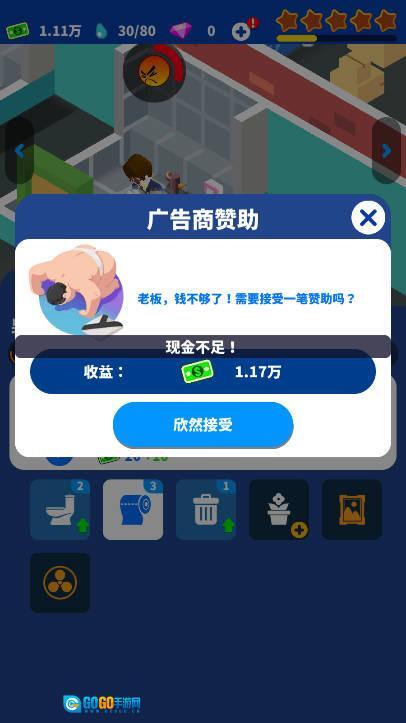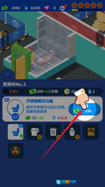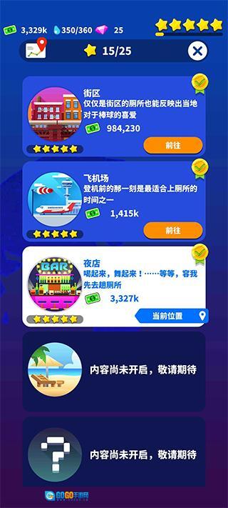 2、在游戏过程中,玩家需要持续进行升级与扩建操作,才能点亮右上角的星星。当星星数量达到特定条件时,就能解锁新地图,进而继续经营你的厕所连锁店。游戏里的每个卫生间都是独立存在的,只要依次将它们升级到最高等级,就可以逐步进行扩建。