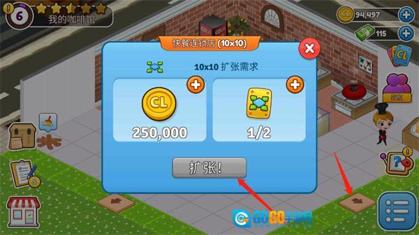 1、点击餐厅外空白的格子,花费金币进行扩张。