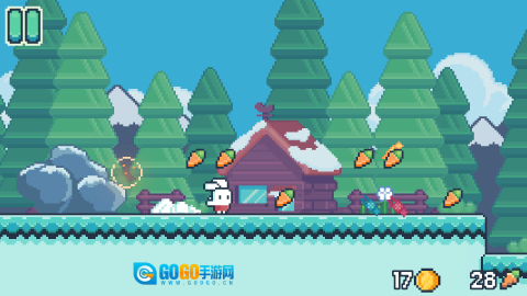 1、借助方向键或虚拟摇杆就能操控小兔子左右移动与跳跃,双击跳跃的功能可助你完成二段跳,灵活避开敌人和障碍;