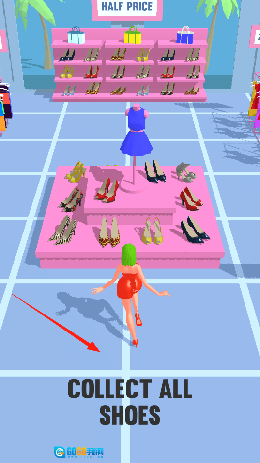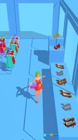 1、进入扫货姐最具沉浸感的购物场景,操控角色在鞋区展开行动,只需围绕鞋架跑动并靠近鞋子就能完成收集,目标是将所有鞋子收入囊中,尽情体验购物收集的趣味玩法。