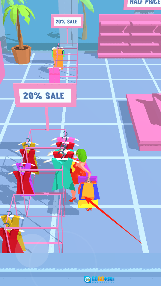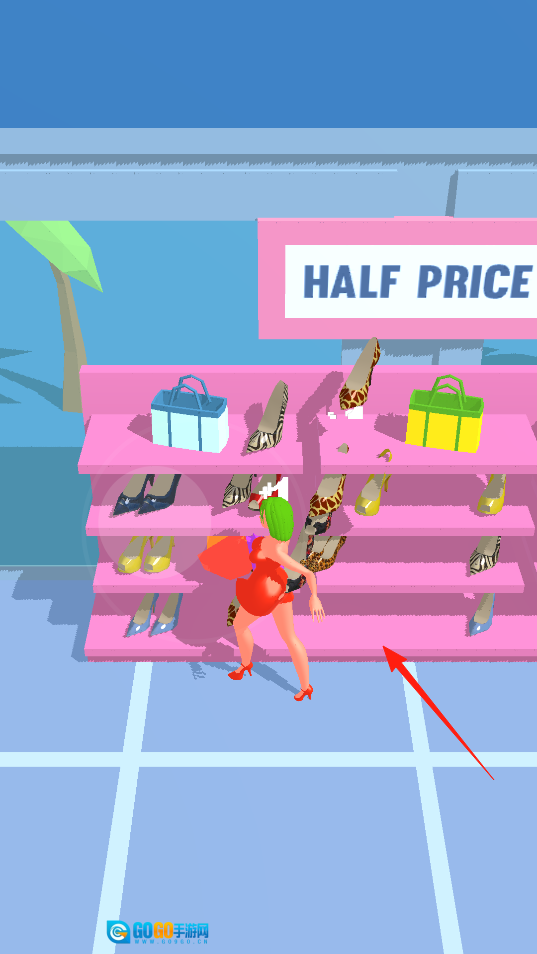 2、进入半价鞋架区域后,操控角色在其中穿梭移动,靠近鞋架去收集自己喜欢的鞋子,把它们添加到购物成果里,让购物袋变得更充实,以此体验该区域的收集类玩法。