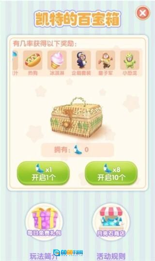 6、使用专属道具月亮石能够开启百宝箱,每次开启宝箱需要消耗1个月亮石,也可以使用8个月亮石一次性开启十个宝箱,开启宝箱后有机会随机得到熊熊乐园、玩偶公仔、食物和金币等物品。
