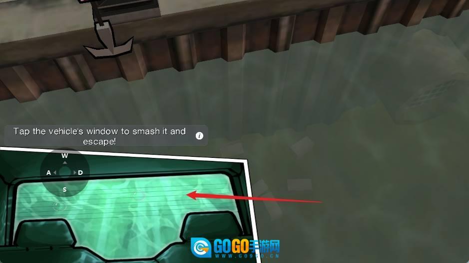 2、连续点击车的前窗,破窗后根据雷达提示来到岸边的提示点处。