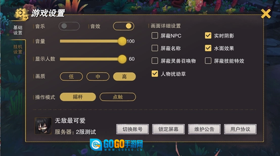 首先,在设置里的操作模式里可以选择摇杆模式或者点触摸式,选择您习惯且舒服的操作模式吧。调整好了操作模式,在下方可以看到画质的设置区域,如果您想要一睹塞尔大陆的美丽风景,就选择超清高画质吧~在右边画面的详细设置里,您可以自由选择想要屏蔽的部分,也可以随意更改场景的一些细节和人物的阴影等设置哟。在设置的最下方,您可以点击切换账号来更换其他账号,不需要下线再重新登录游戏,是不是非常方便呢~