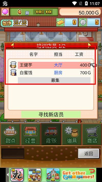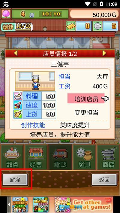 3、进入店员情报界面后,能看到店员信息、培训店员以及变更职位担当的功能,同时在左下角可以看到“解雇”按钮,点击该按钮即可解雇该员工。