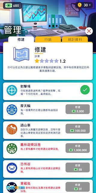 4、当资金充裕时,可点击管理界面里的修建选项来增设更多游乐设施