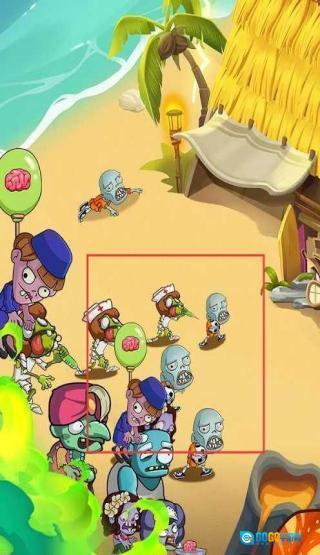 1、识别红框内的僵尸(包括护士僵尸和普通僵尸),对其实施优先攻击策略,借助植物具备的特性(例如减速效果、高额攻击力等),对僵尸的推进进行拦截,以守护我方阵地。