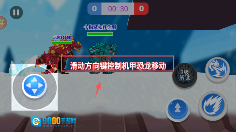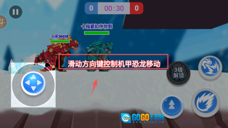 2、接着,通过滑动方向键操控机甲恐龙移动,避开障碍物,搜寻敌人并展开战斗。