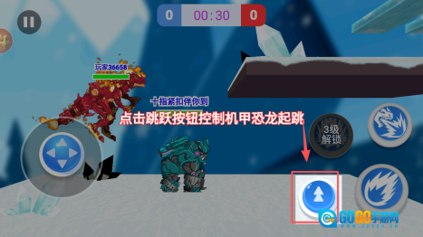 3、接下来,点击跳跃按钮操控机甲恐龙起跳,跨越障碍,借助跳跃抵达更高的区域。
