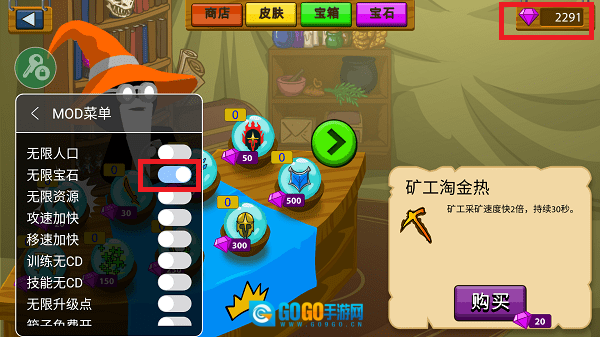 在战斗过程中,每个士兵的召唤都需要消耗一定数量的矿石;要是负责挖矿的工人效率太低,你可以点击界面上的“闪电”标识,通过花费钻石来提升挖矿的速度。