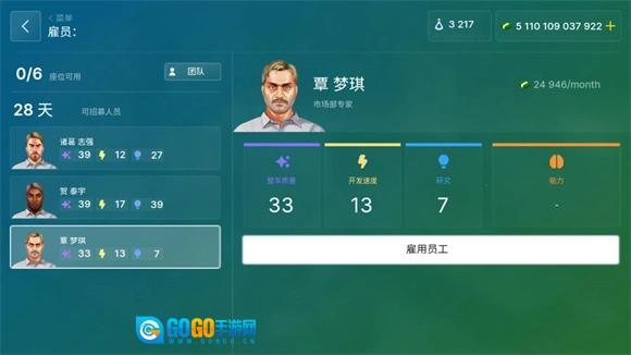 在主界面点击下方最右侧的小人图标,就能雇佣各类员工,每个员工都有着独特的属性。