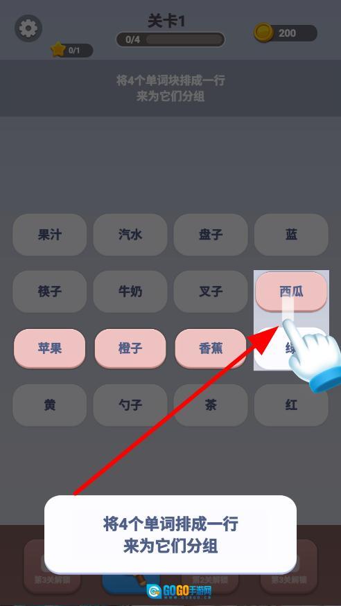 进入关卡后,请依据提示把4个单词排成一行完成分组操作。在此过程中需仔细观察每个单词,挑选出契合主题的单词进行排列,从而完成分组任务。