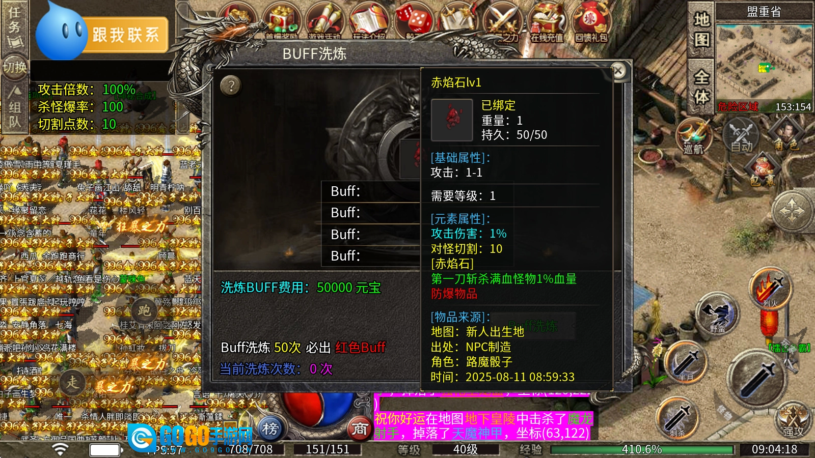 BUFF洗练规则:消耗元宝能够对赤焰石开展洗练操作,过程中会随机生成BUFF效果,累计洗练达到50次时必定会出现红色BUFF。