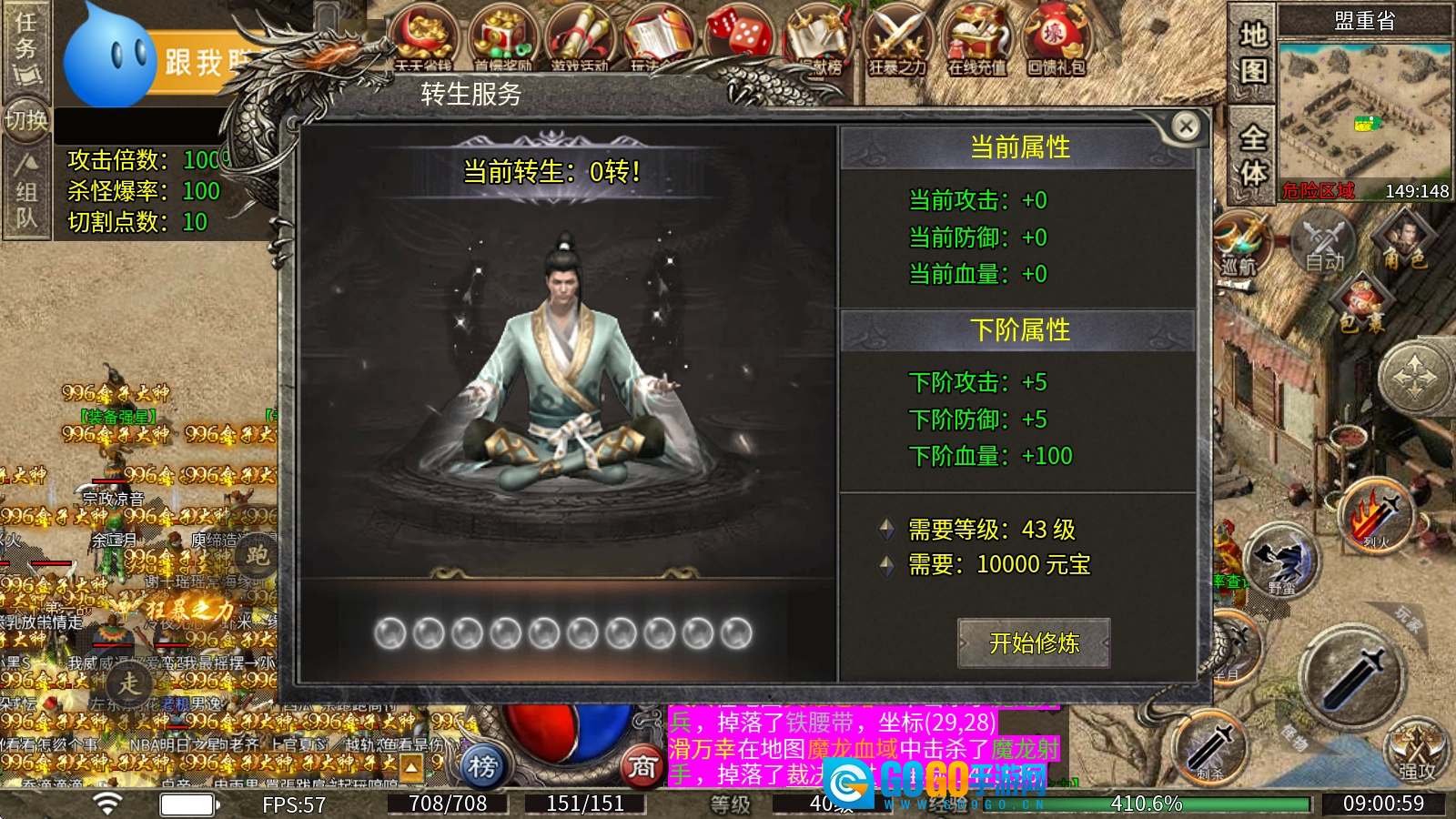 转生功能:等级到达43级以后消耗元宝即可进行转生,每一级都将提供攻击、防御和血量加成。
