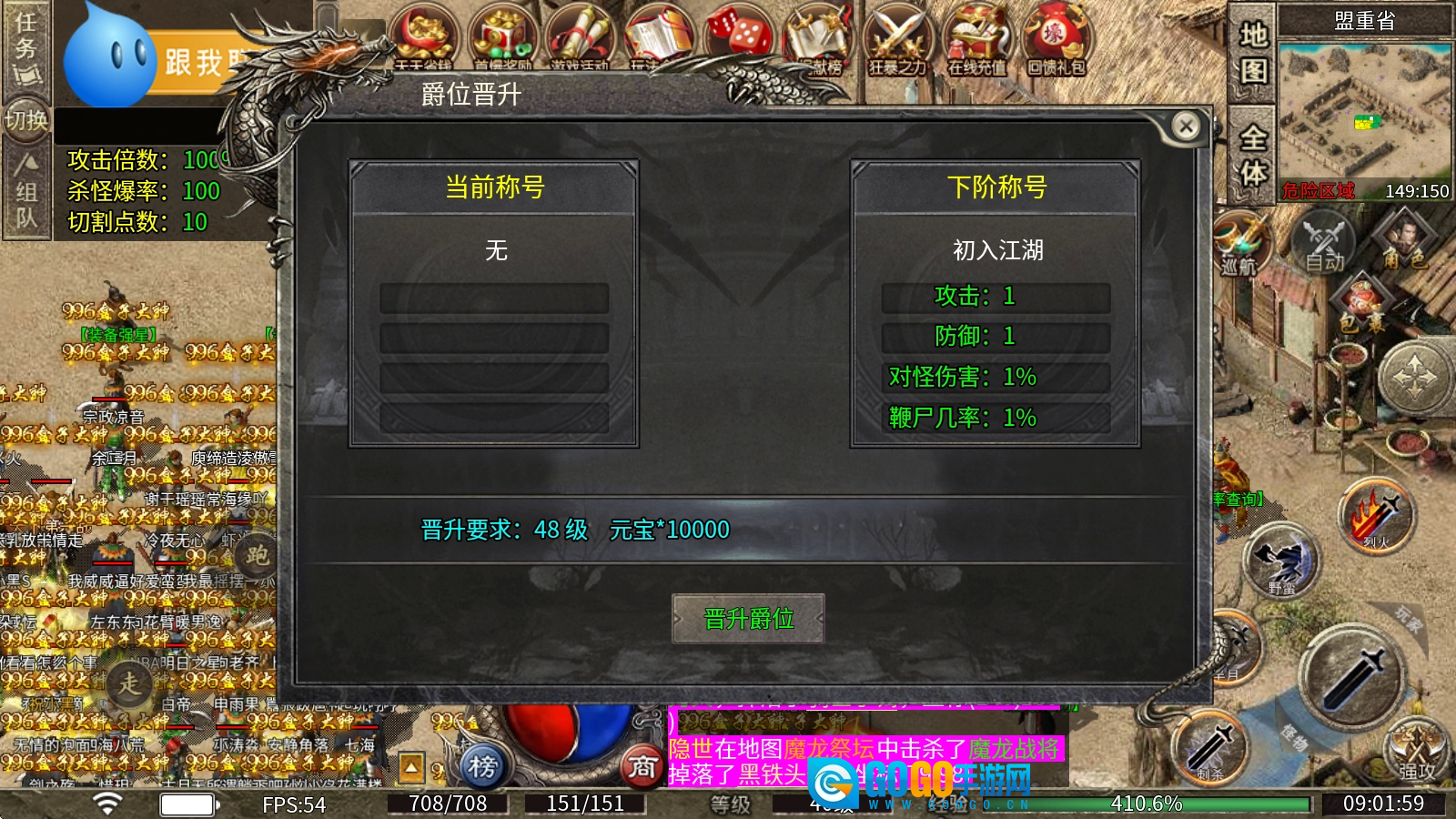 称号晋升规则如下:当等级达到48级后,消耗一定数量的元宝就能完成晋升。此次晋升不仅能提升角色的攻击与防御属性,还会额外增加对怪物的伤害值以及鞭尸的触发几率。