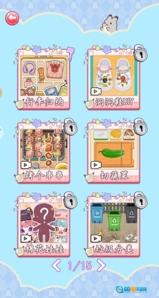 打开游戏后,首先需要选择具体玩法,可选的包括行李收纳整理、洞洞鞋创意DIY、制作烤串以及蔬菜切割等项目。