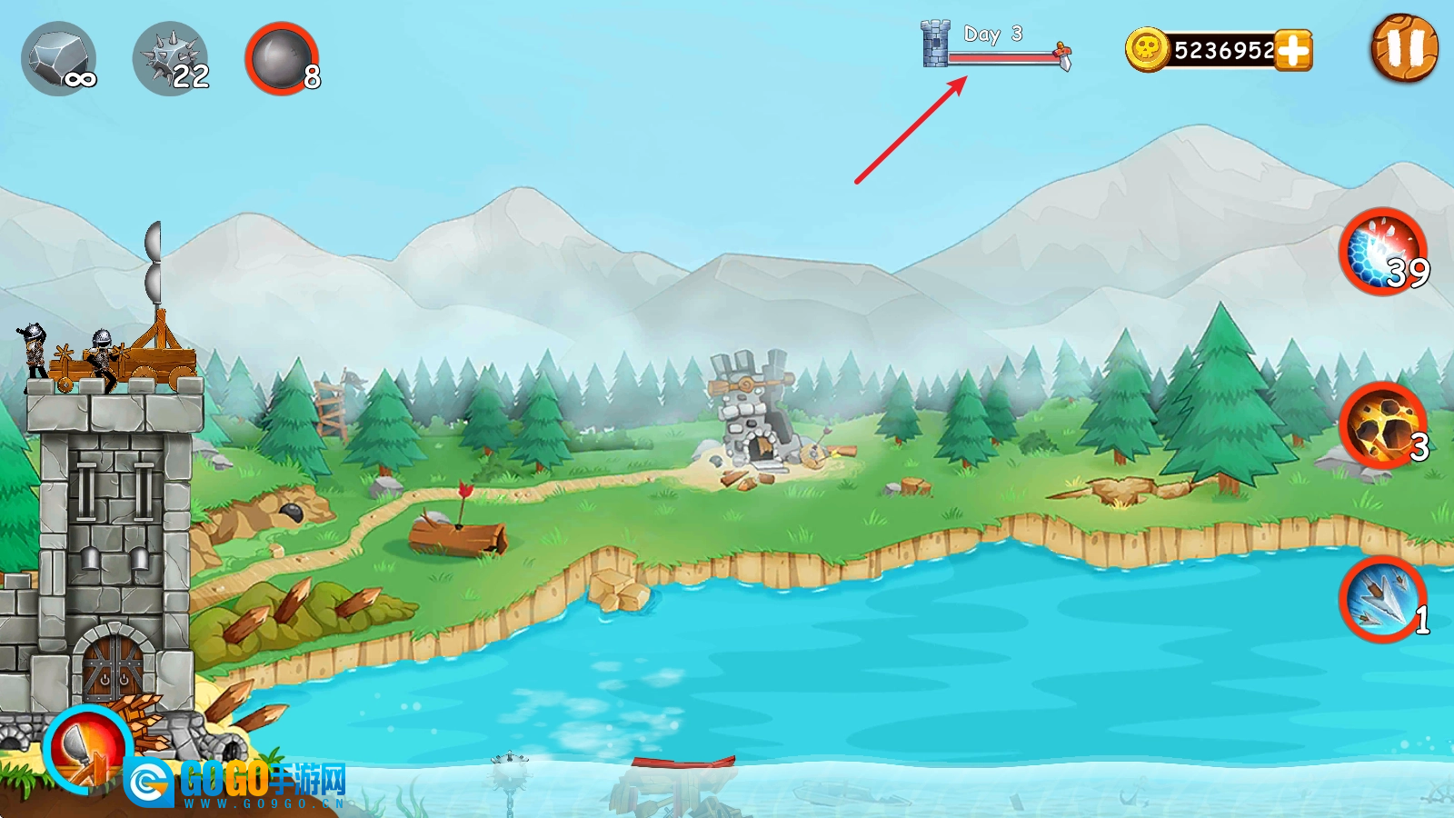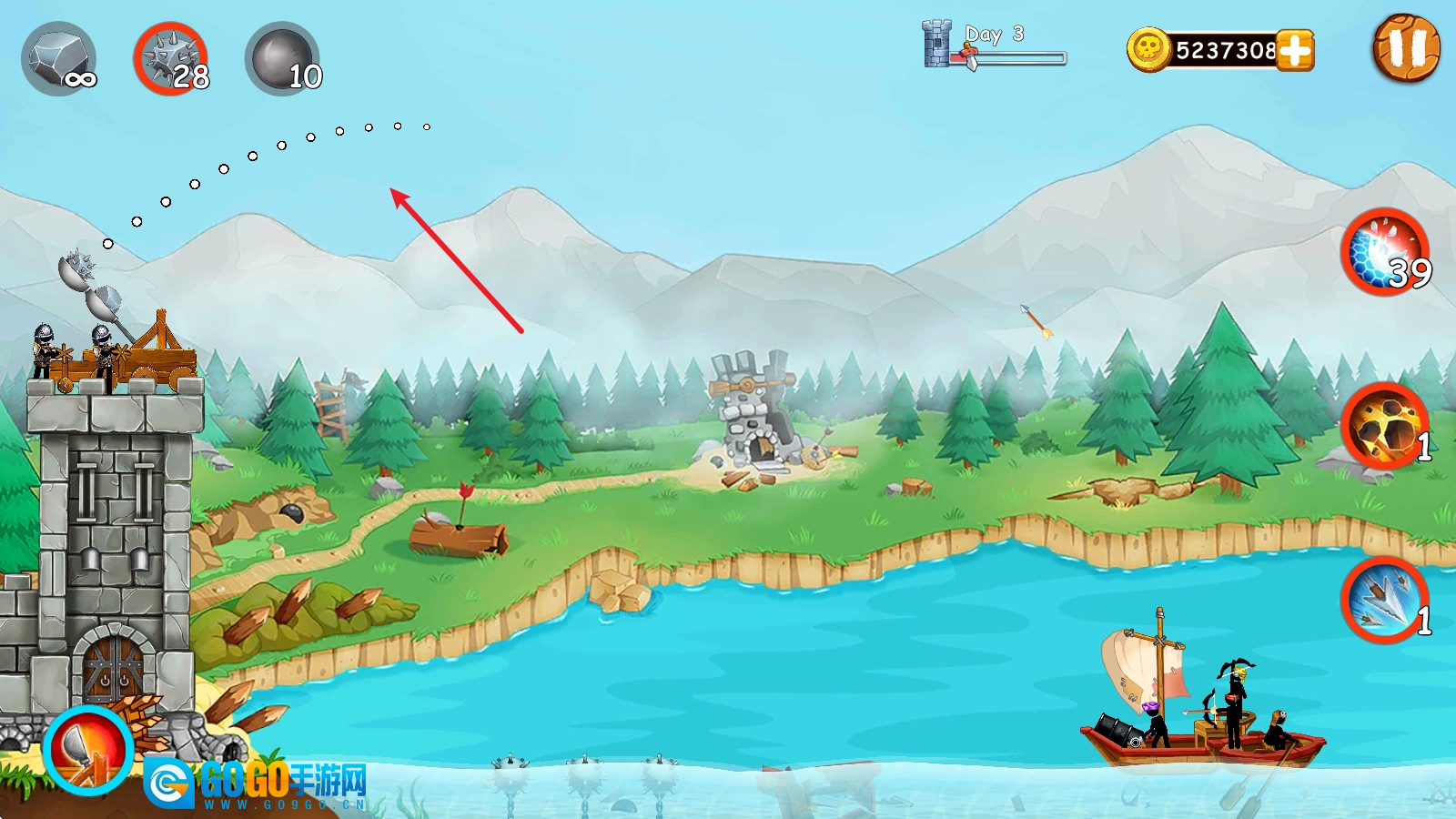 在关卡里,拖动屏幕会出现瞄准线,松开手就能发射炮弹。