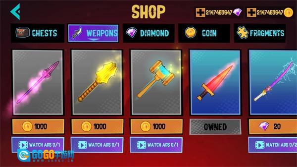 在游戏主界面点击“shop”按钮即可进入商店界面,在商店中能够使用金币购买各类武器,购买完成后将其装备,这样在游戏开局时就能直接获得该武器了。