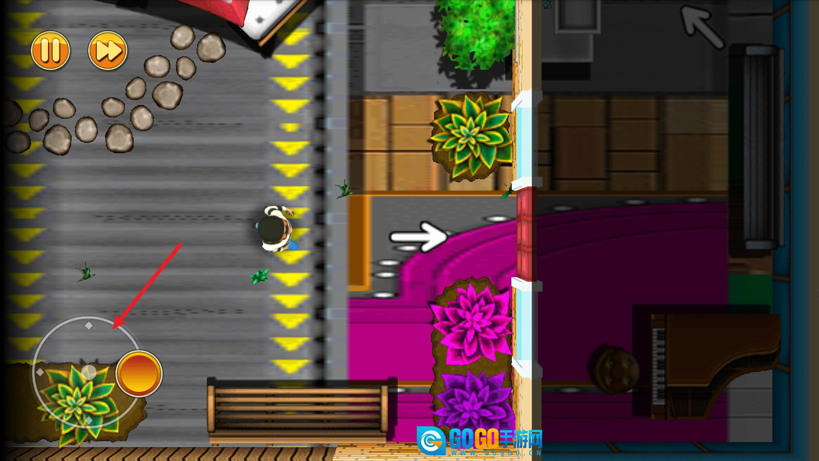 游戏中通过左侧的摇杆控制人物移动。