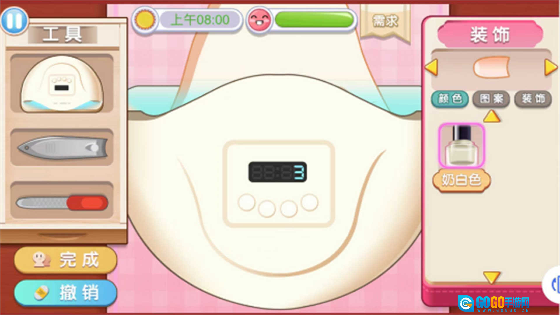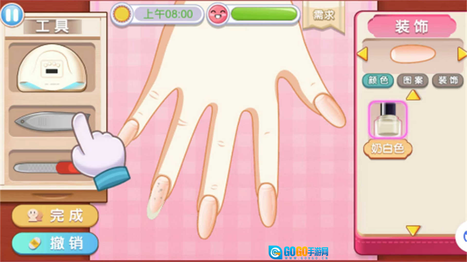 1、打开游戏后,先对美甲店进行布置;接着点击接待顾客,了解其美甲需求;随后从工具界面中选择打磨、去死皮工具来处理甲面;最后挑选指甲油和图案装饰进行美甲创作。