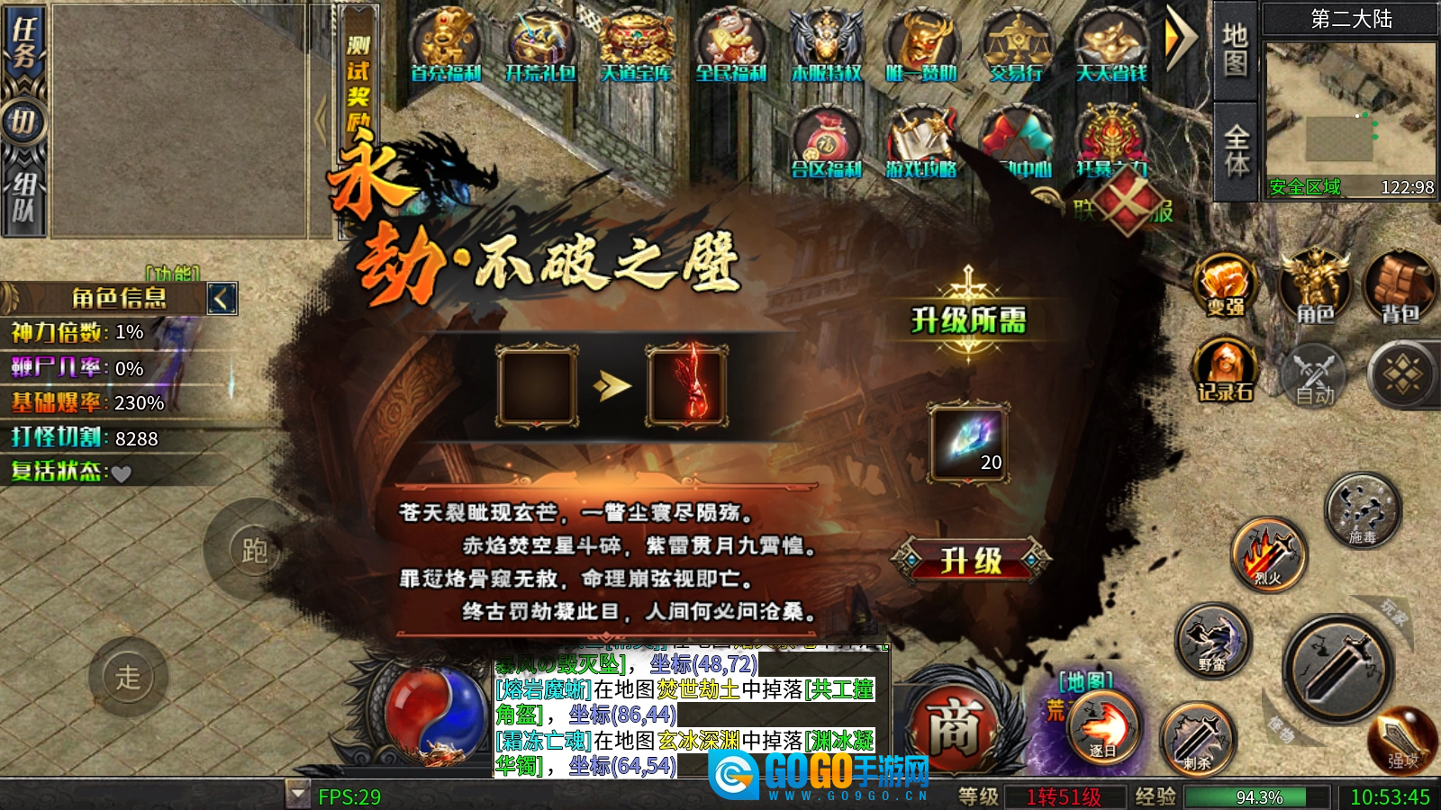 不破之壁:消耗鸿蒙石提升等级,可增加攻魔道基础属性,同时还能获得各类元素属性。