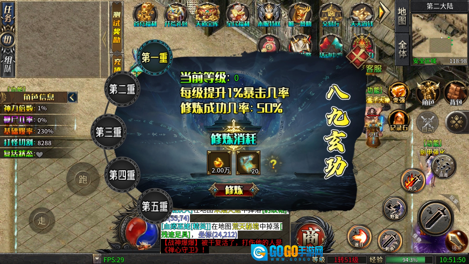 八九玄功:修炼需消耗元宝与玄功残页,共设五重境界。每提升一重境界的等级,皆能获取相应加成;当等级达到特定阶段时,还可额外获得对怪物的伤害加成以及对怪物的爆率加成。