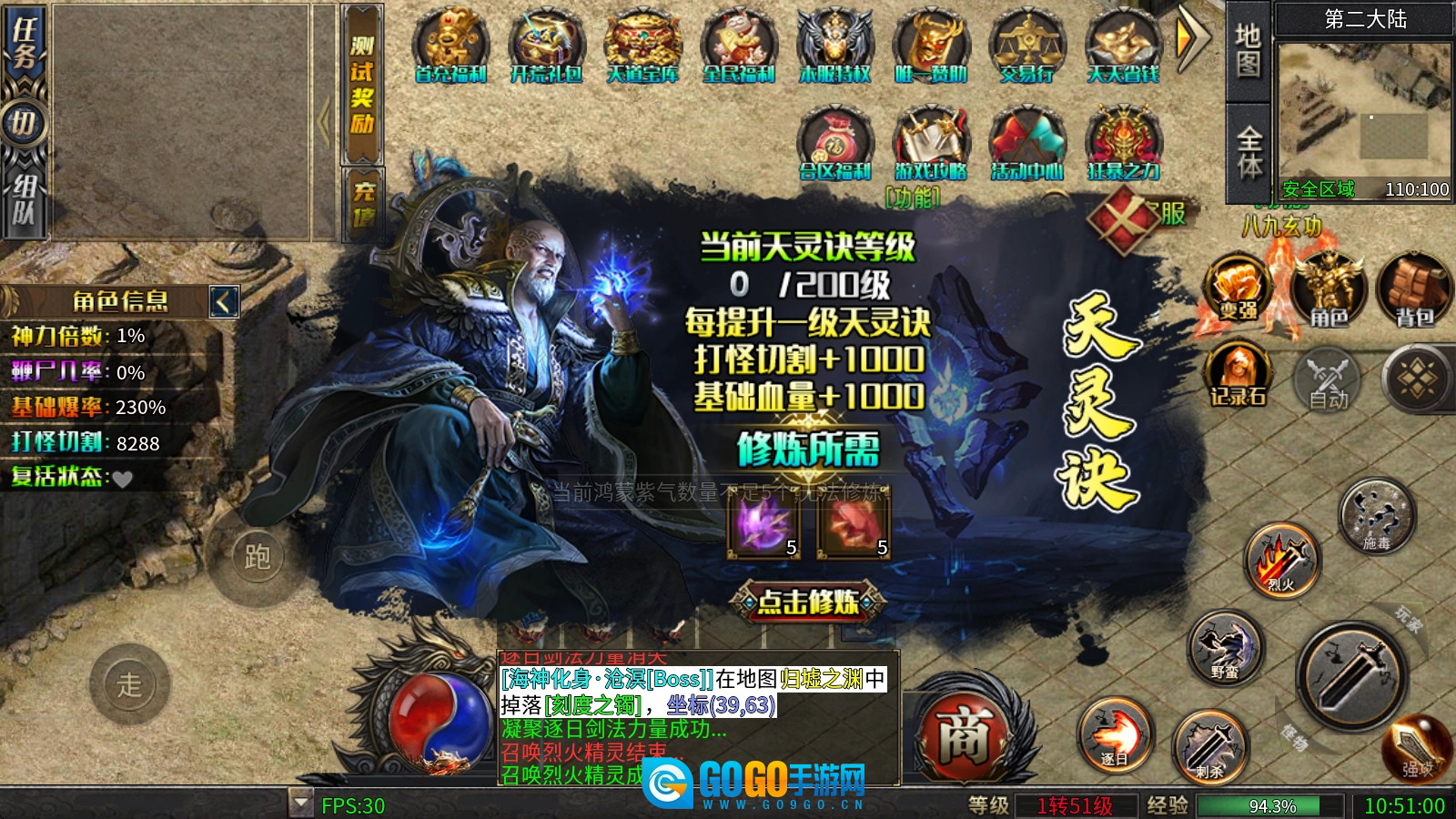 天灵诀:需消耗鸿蒙紫气与盘古精血来提升等级,每提升一级,都能增加打怪时的切割伤害以及自身的基础血量。