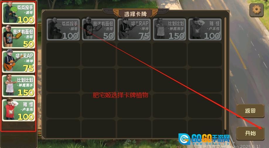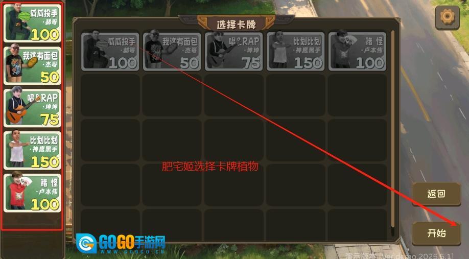 3、挑选你心仪的卡牌植物角色,将其添加至植物备战栏,随后正式开启关卡挑战。