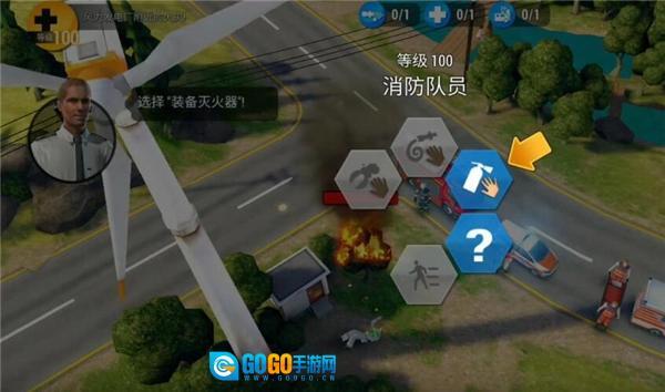 然后依据不同的突发状况确定对应的技能部门,在此我们会派遣消防员来开展处置工作,请点击消防员并选中他。