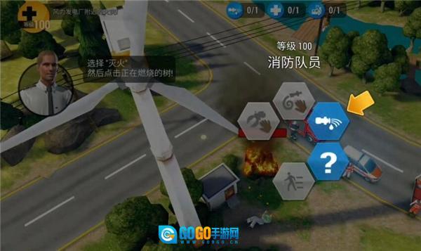 选择灭火,然后点击正在燃烧的树;
