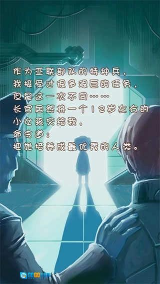 2、点击屏幕开始剧情介绍:亚联部队的长官将一个12岁左右小女孩交给身为特种兵的主角培养。