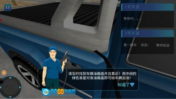 3.如下图,控制角色走到对应的车道,拿起加油枪按照客人的需求完成加油任务。