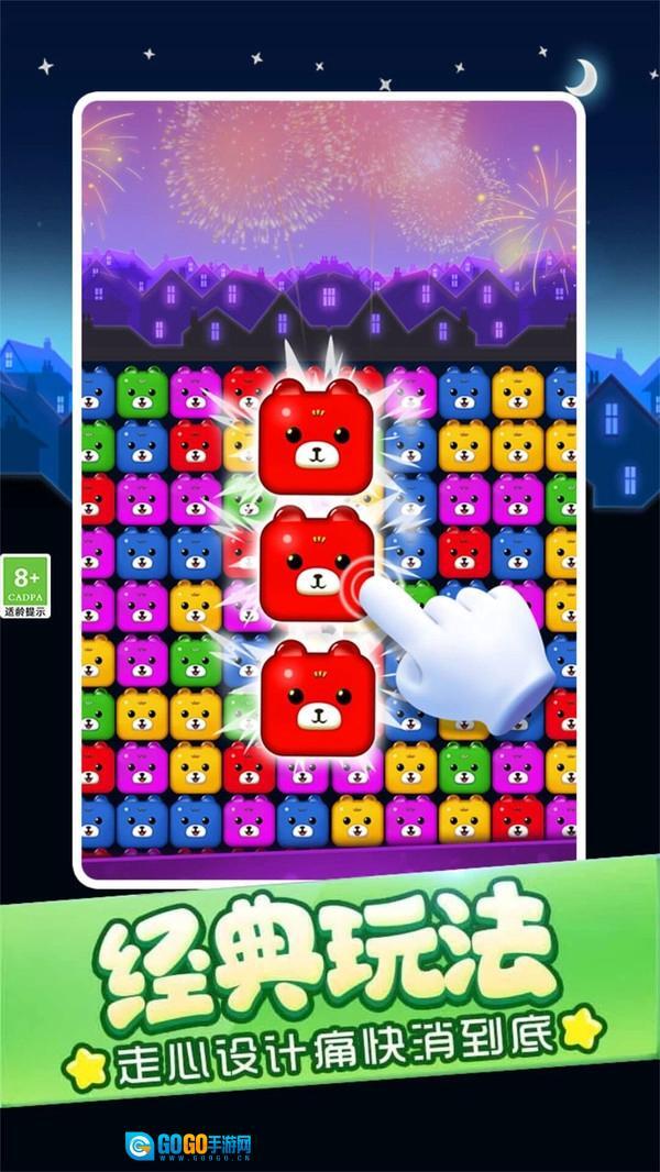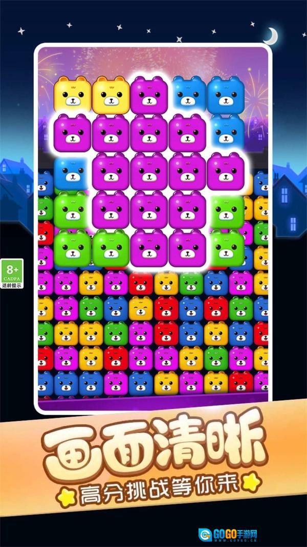 1、以熊为主题的可爱消除游戏,点击相同颜色的方块即可获得高分。