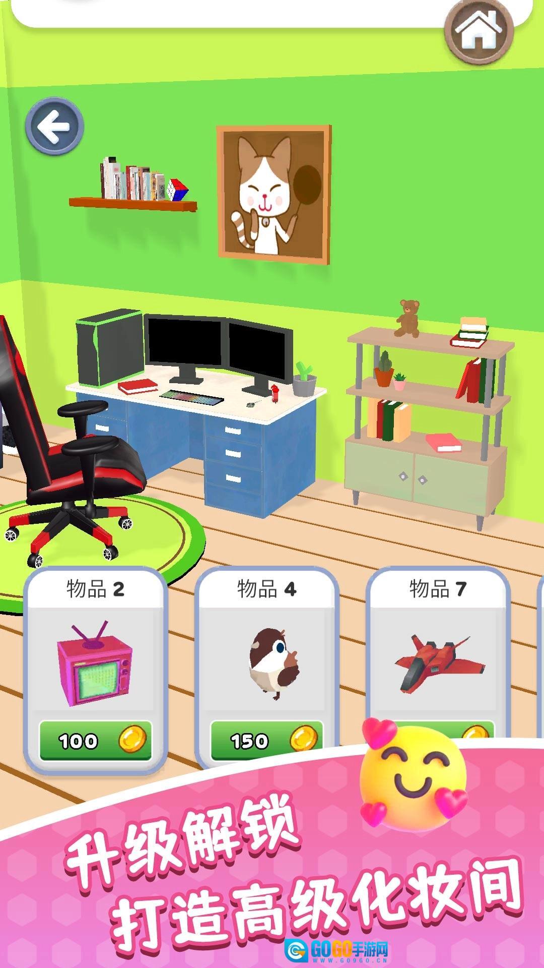 3、购置粉色小电视播放美妆教程,摆放毛绒玩偶装饰空间,解锁更多家具。