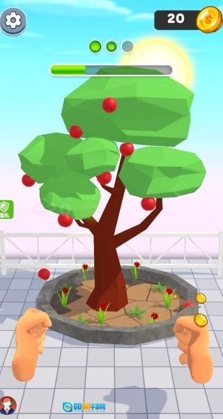 3、当小树结满了果子,点击屏幕上的拳头图标,用力敲打树木,就能收获果子啦。
