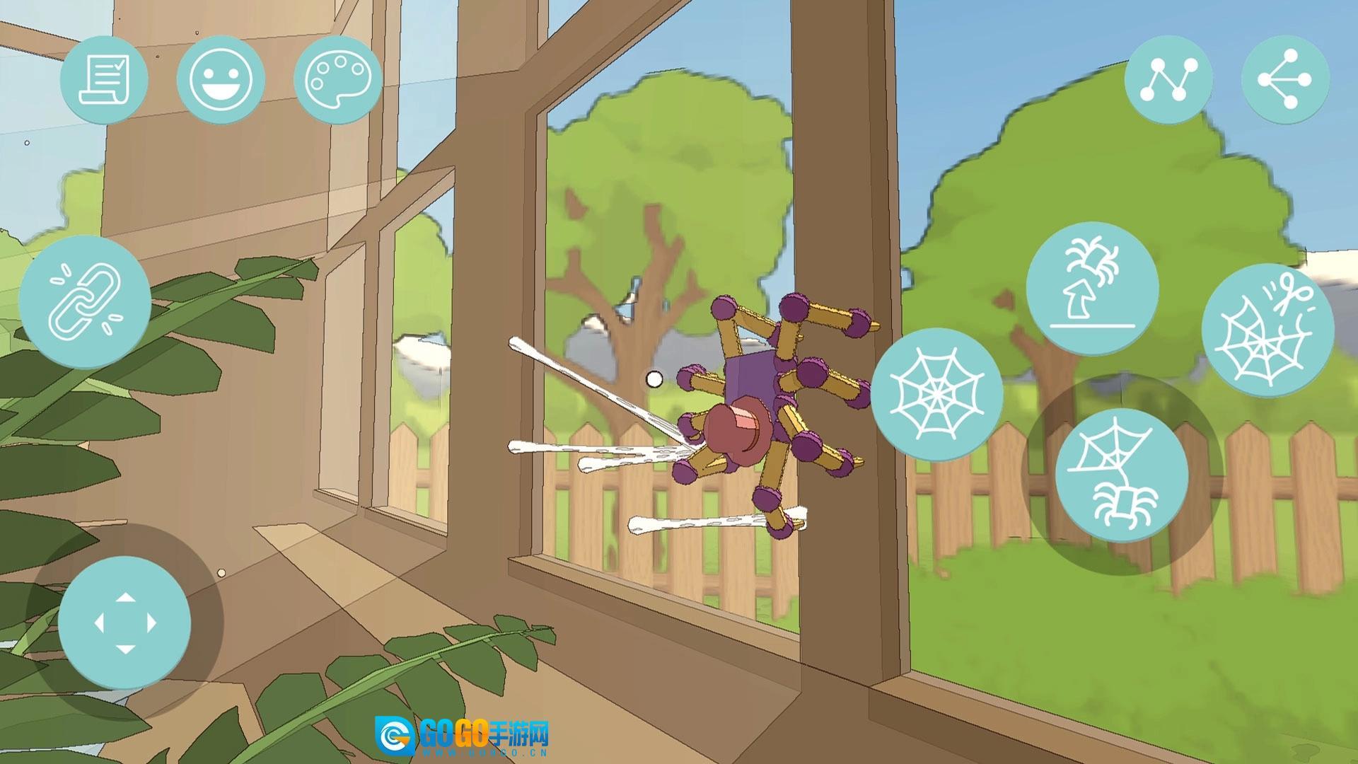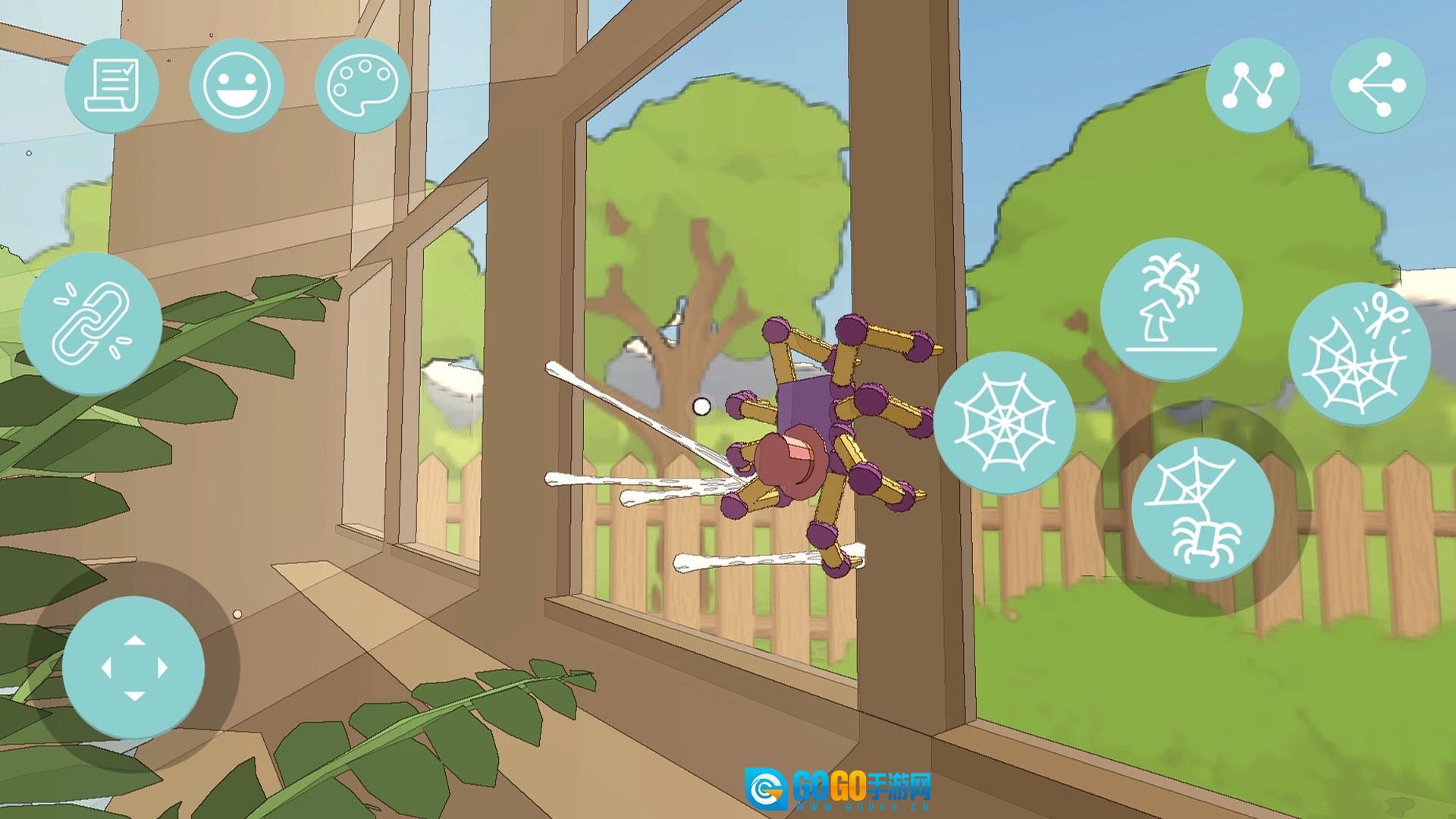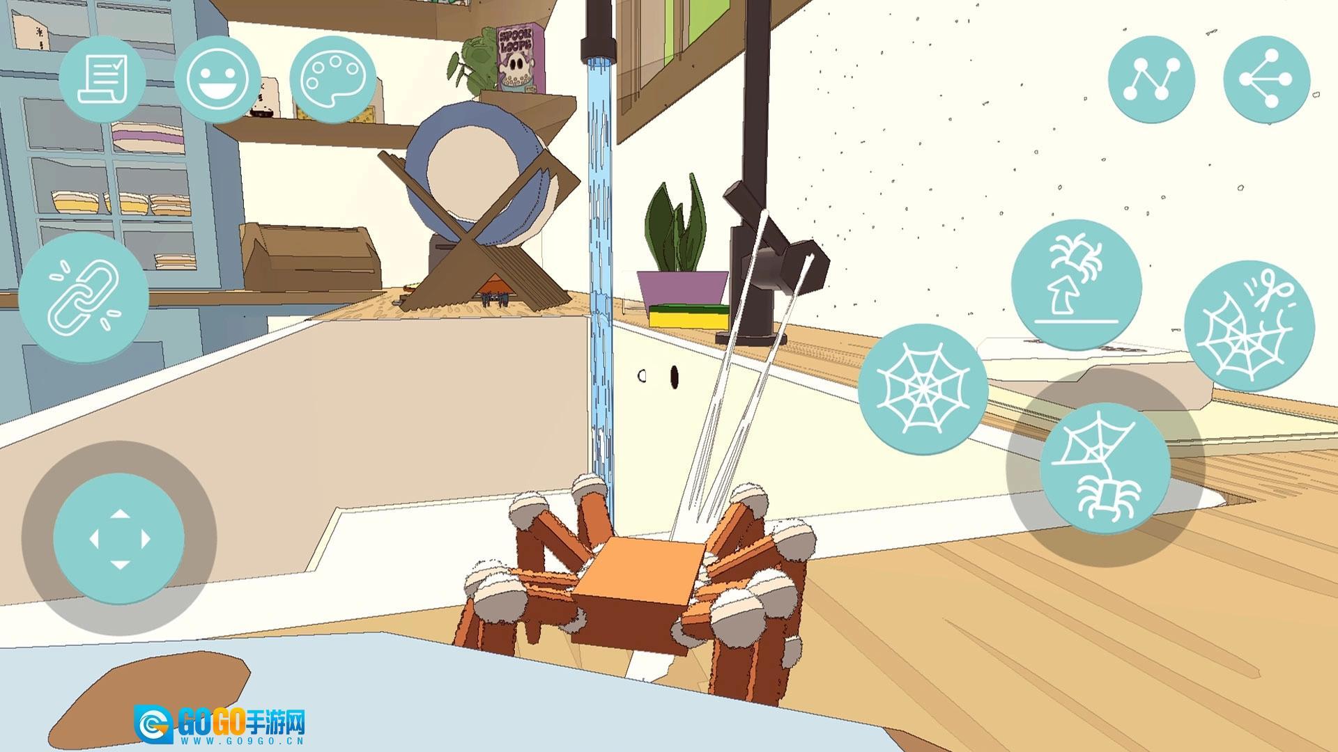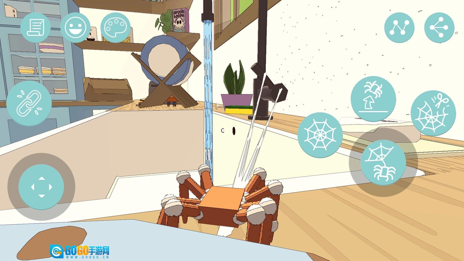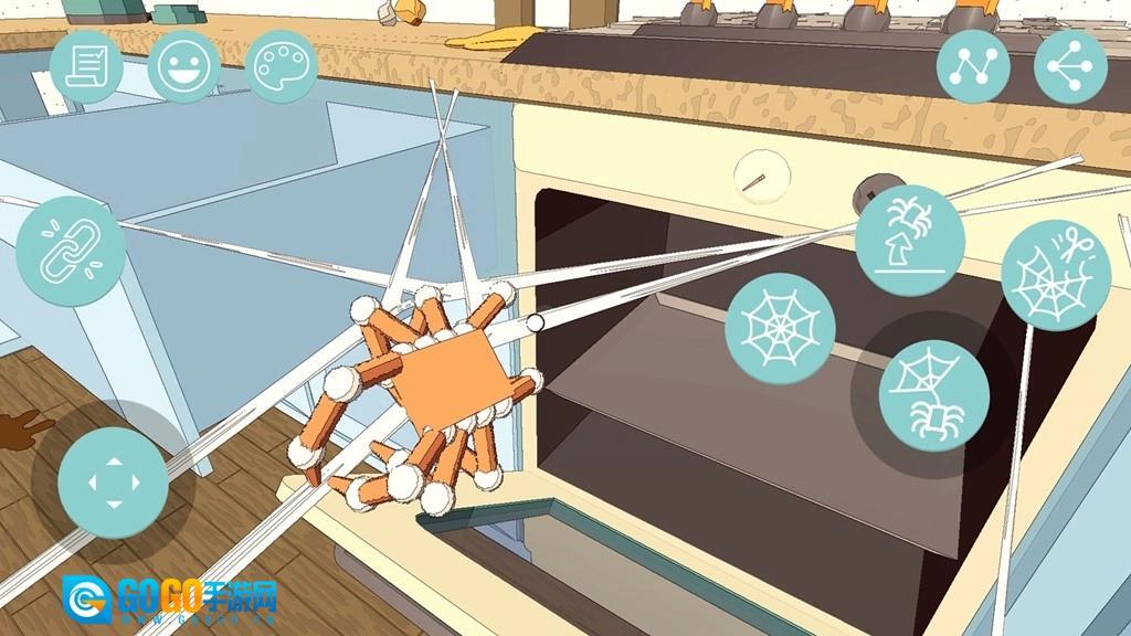 1、滑动虚拟摇杆控制蜘蛛移动、攀爬,点击蛛网按钮喷丝,黏住物品摆荡、拖拽,探索场景。