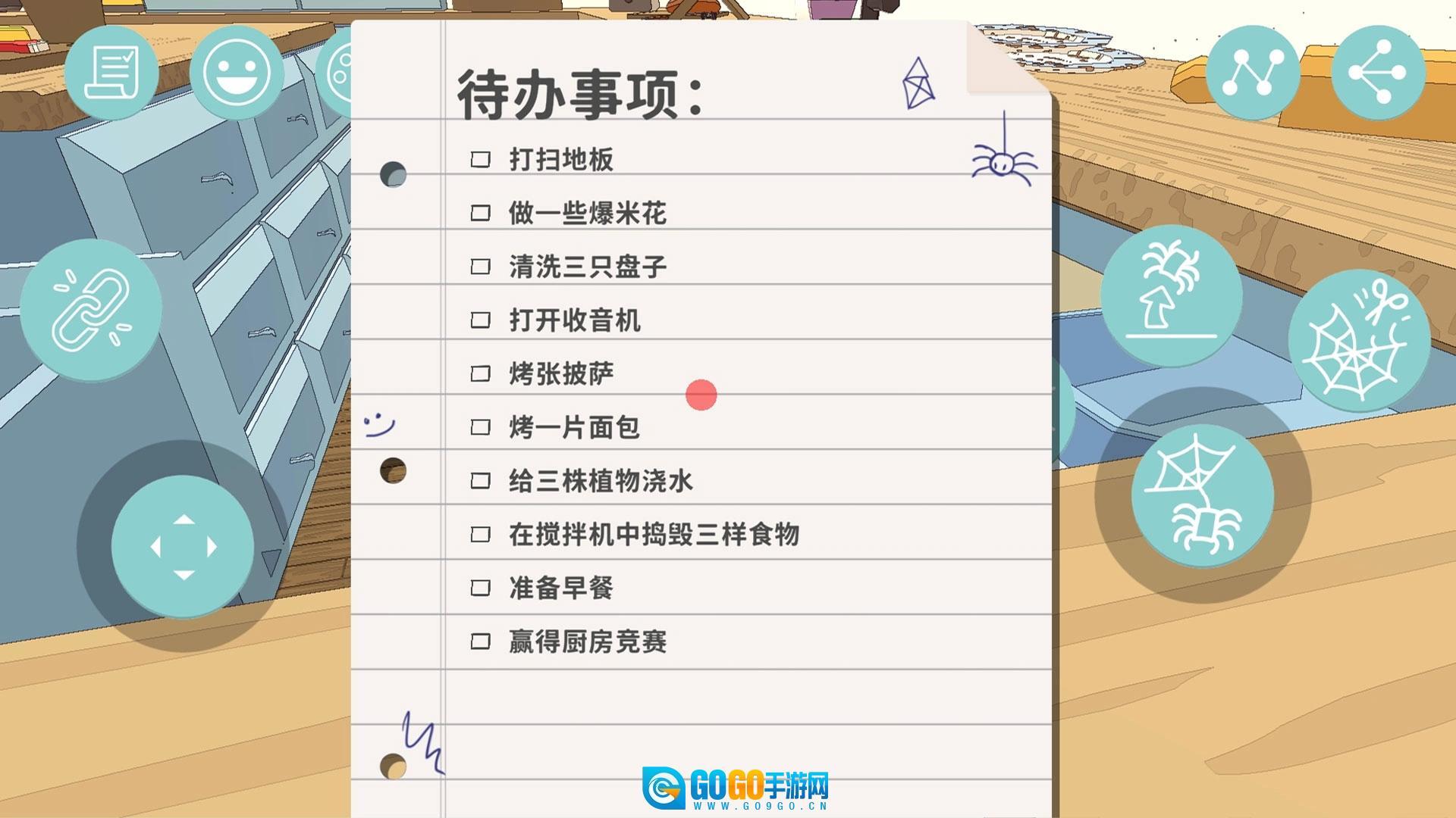 2、查看待办事项清单,按任务要求如烤面包、浇花,用蛛丝操作对应物品烤箱水壶。