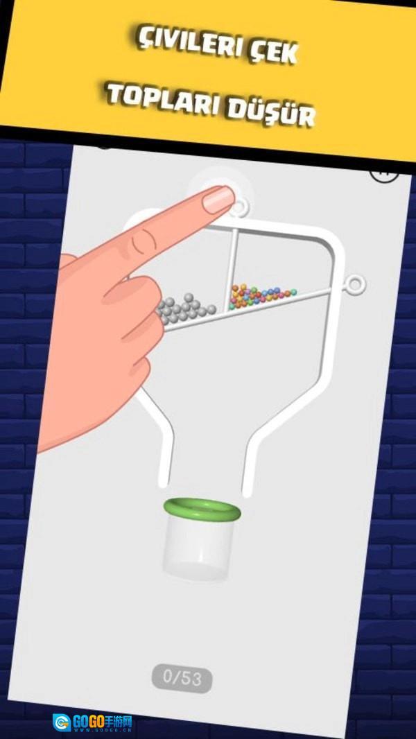 2、沿着针环的方向划过去,就可以把针去掉,将关卡内所有针都去掉,球就会掉下来;
